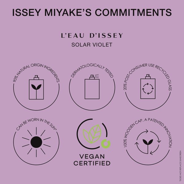 Pour rendre hommage à la nature, ce parfum est composé à 90 % d’ingrédients d’origine naturelle. La violette 100% d’origine naturelle contenue dans L’Eau d’Issey Solar Violet est sourcée de manière responsable en Égypte.