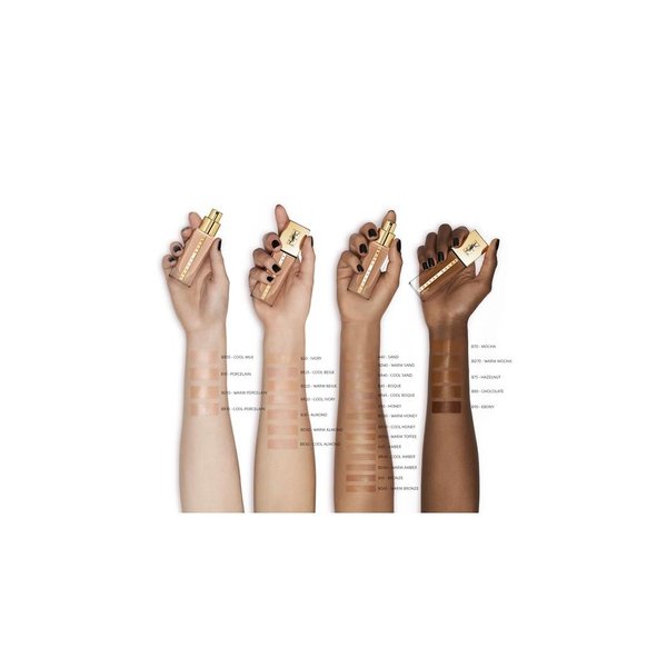 COUVRANCE JUSQU'À 24H DE TENUE. HYDRATATION 24H. ÉCLAT NATUREL SUBLIMATEUR DE PEAU.TEINT ZÉRO DÉFAUT.Yves Saint Laurent Touche Eclat Le Teint Fond de Teint apporte une couvrance moyenne sans effet masque jusqu'à 24h de tenue* et 24h d'hydratation**. Enrichie de fleurs de Calendula et de Mauve d'origine naturelle issues des Jardins Collectifs de l'Ourika YSL Beauté, cette formule apporte un éclat naturel pour une peau zéro défaut. Le complexe YSL Glowing Hydration ComplexTM composé de fleur de Mauve ainsi que de Glycérine, insuffle à la peau 24h d'hydratation la protégeant de la sècheresse et de l'effet teint terne.*Test du consommateur - 102 femmes.**Test instrumental - 24 femmes.