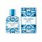 Le flacon aux lignes courbes et au bouchon émaillé est orné de motifs décoratifs en majolique bleue de Capri.