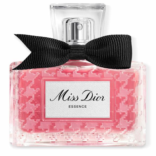 Miss Dior Essence s'affirme tout en renouant avec son identité originelle, réinterprétant le flacon patrimoine imaginé en 1948 par Christian Dior : un motif pied-de-poule givré ainsi qu'un nœud poignard de gros grain noir fabriqué en France, qui habille une précieuse coiffe en verre.