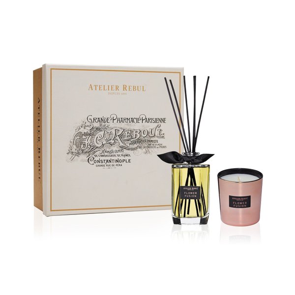 Le coffret se compose de la boîte cadeau Atelier Rebul, des bâtonnets parfumés Flower Fusion 120 ml et de la bougie parfumée Flower Fusion 210 g.
