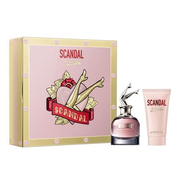 A l’intérieur, un écran rouge velours comprenant l'iconique Eau de Parfum Scandal et sa Lotion Parfumée pour le corps.