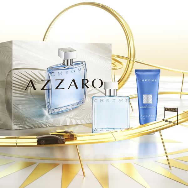 Azzaro Chrome célèbre la joie de vivre, les sentiments authentiques, et rend hommage au lien indéfectible qui unit un père et son fils. Cette fragrance incarne l'évasion par sa fraîcheur vivifiante, apaisante et élégante : une fraîcheur suave et sophistiquée (notes d'agrumes et de musc blanc) associée aux notes vertes et aquatiques liées à l'aventure, le tout renforcé par un accord boisé de thé (bois de santal, ambre, maté). Ce coffret cadeau Azzaro contient :